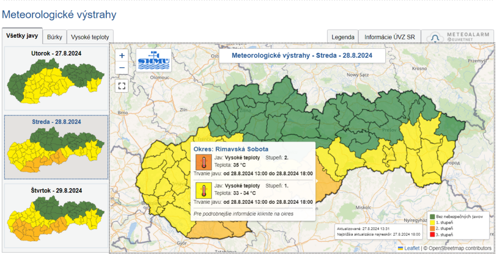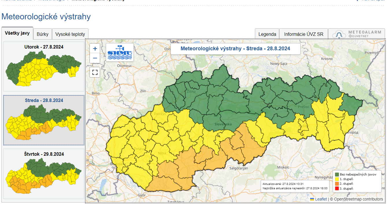 Výstrahy sú vydané najmä na popoludnia. Prehánky sú očakávané veľmi ojedinele a horúce počasie nás bude sprevádzať aj v septembri. Dbajte na dostatočnú ochranu hlavy i pokožky a nezabúdajte na dostatočnú hydratáciu.