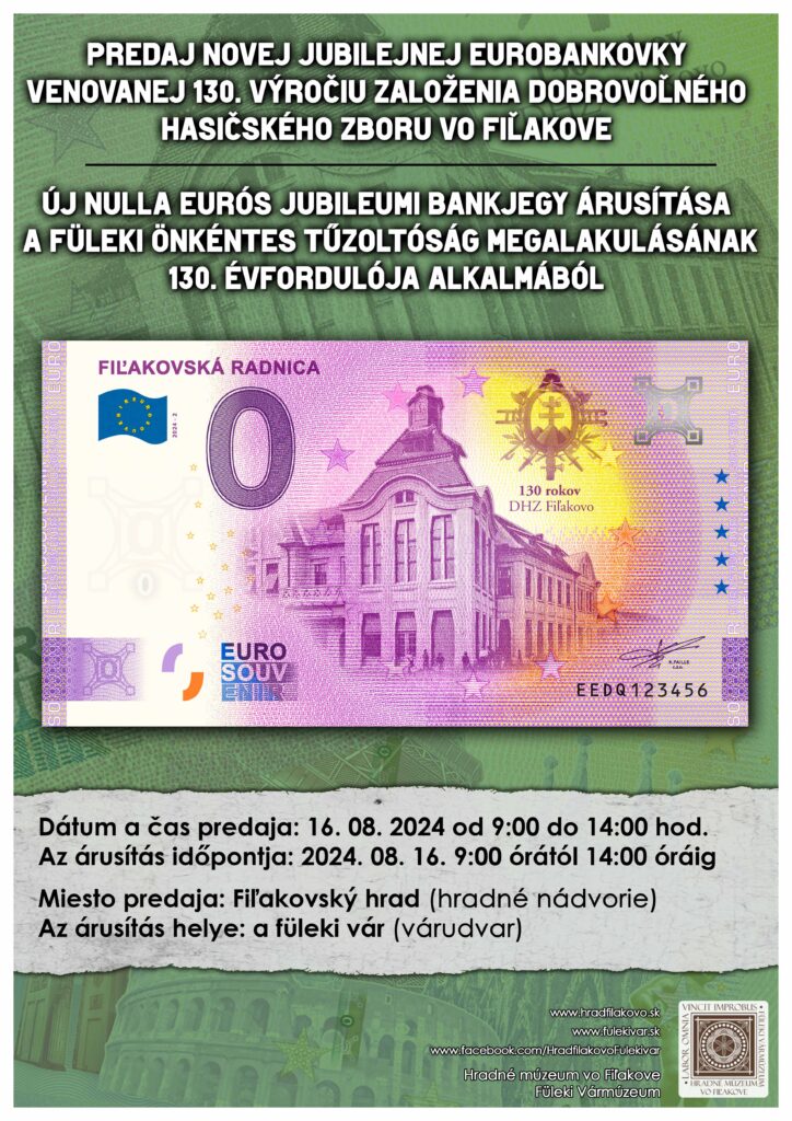 Významným momentom dňa 16. augusta bude aj prvotný predaj nulovej eurobankovky vydanej pri príležitosti 130. výročia založenia DHZ vo Fiľakove. Bankovka, ktorá bude zobrazovať radnicu a erb zboru z roku 1929, bude v predaji od 9:00 do 14:00 hod. na nádvorí dolného hradu. Po tomto dátume bude možné bankovku zakúpiť v kancelárii NTIC a v hradnej pokladni.