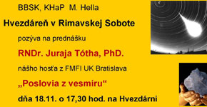 Poslovia z vesmíru, taký je názov prednášky, ktorá sa bude konať vo štvrtok, 18. novembra o 17.30 hod. v rimavskosobotskej hvezdárni. Astronóm Juraj Tóth z Fakulty matematiky, fyziky a informatiky Univerzity Komenského v Bratislave porozpráva o padajúcich hviezdach, hľadaní košického meteoritu a prinesie aj jeho úlomok.
