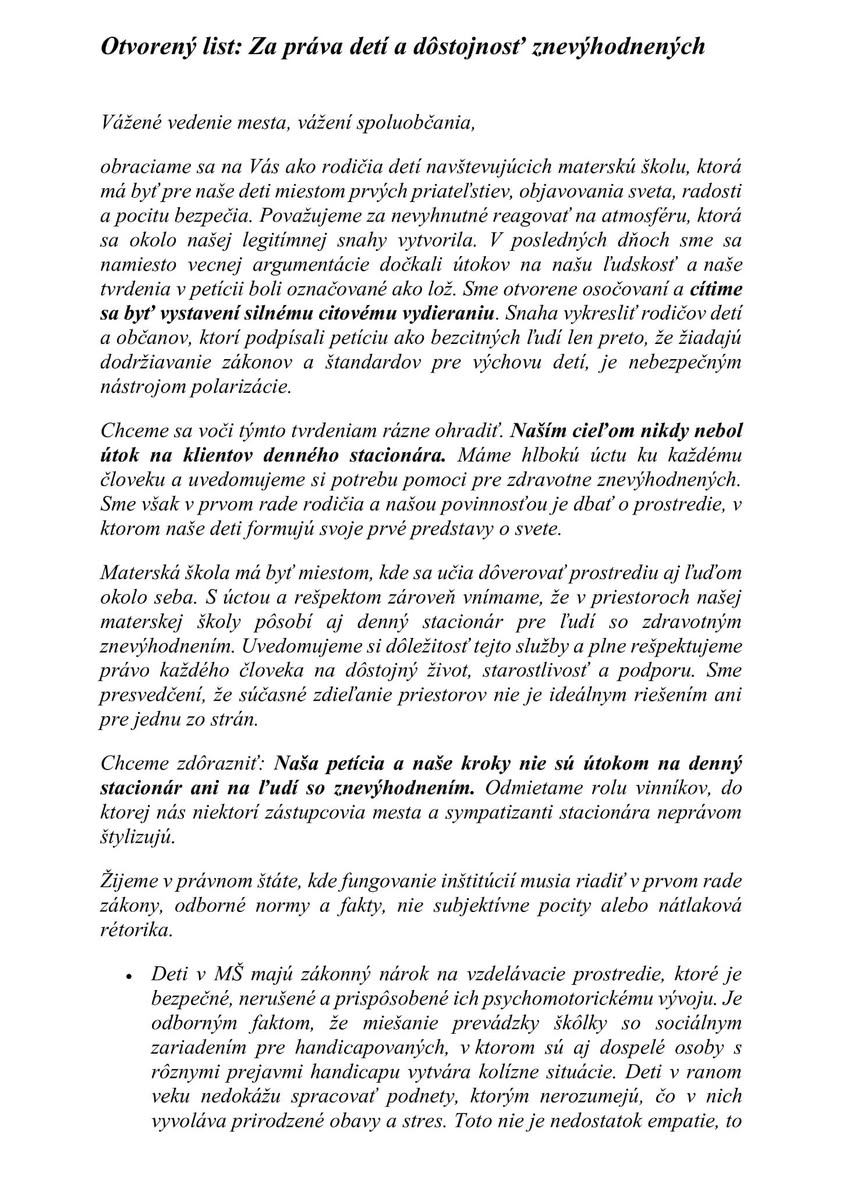 Rodičia detí MŠ preto v liste žiadajú navrátenie priestorov škôlky pre deti na účely predprimárneho vzdelávania. Ako sa v liste uvádza, ich cieľom nebol útok na klientov denného stacionára. "Odmietame rolu vinníkov, do ktorej nás niektorí zástupcovia mesta a sympatizanti stacionára neprávom štylizujú," píšu.