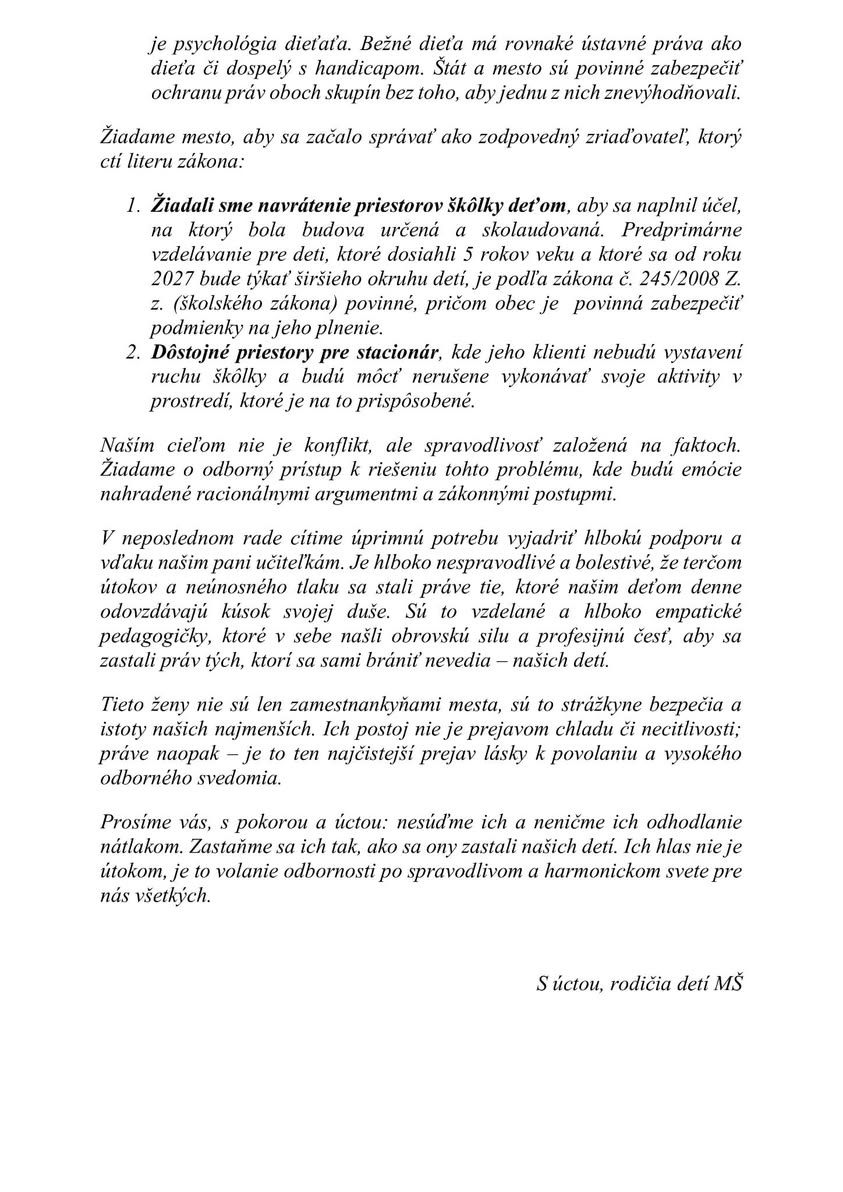 Mesto ďalej apeluje na trpezlivosť a vecný prístup a tvrdí, že jeho cieľom je nájsť riešenie, ktoré bude spravodlivé, bezpečné a prospešné pre všetky deti a rodičov škôlok aj detského stacionára.