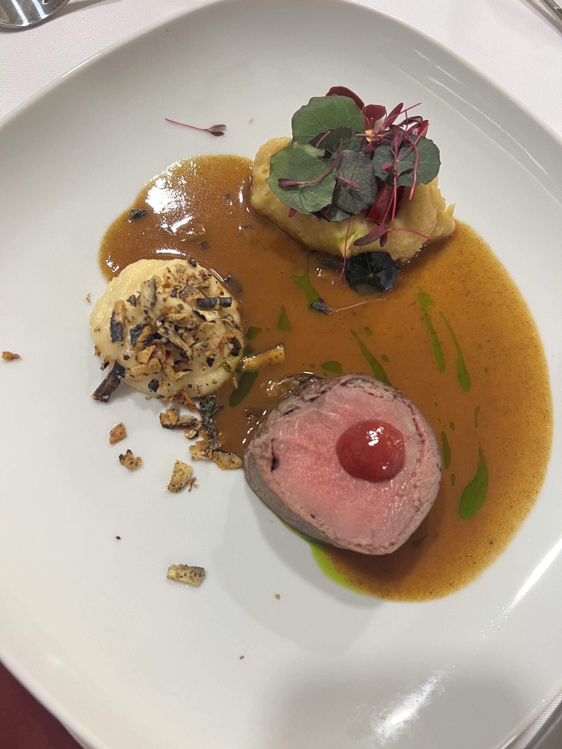 Fero Sedlák – hlavné jedlo: Jelení chrbát fermentovaná slivka, čierny koreň, paštrnákové pyré, jemne údený jus, čučoriedky