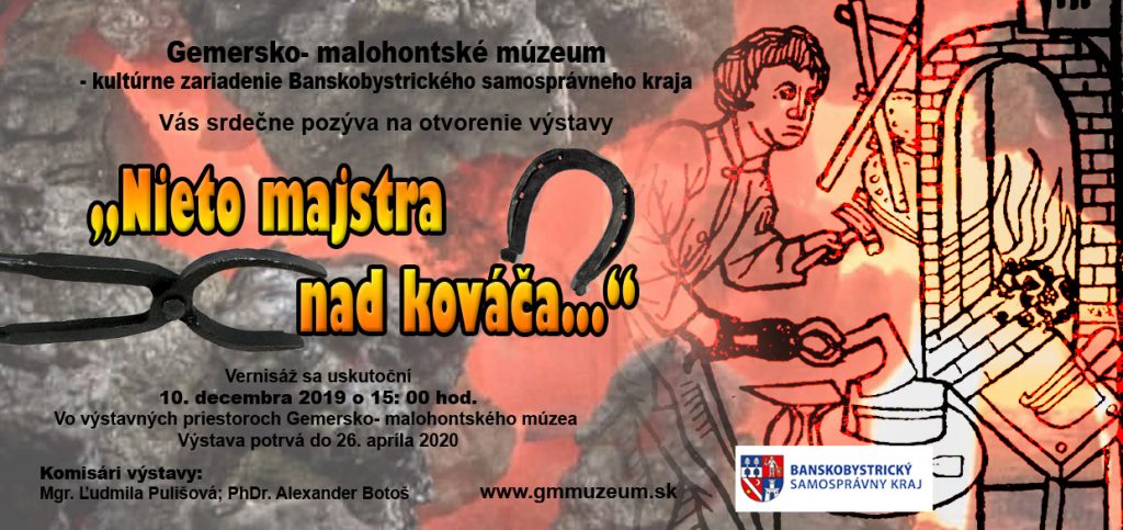 Priestory Gemersko-malohontského múzea budú v utorok 10. decembra o 15:00 hod. patriť vernisáži výstavy „Nieto majstra nad kováča…“, ktorá je venovaná vývoju kováčskeho remesla v Gemeri-Malohonte. Výstava predstaví prostredníctvom fotografií, trojrozmerných artefaktov a sprievodných textov tradíciu tohto kovospracujúceho remesla, ako jedného z najstarších odvetví ľudskej činnosti. Zameria sa na prezentáciu kováčskeho náradia, technológií, prácu vo vyhni, no i na sociálne a spoločenské postavenie kováča v dedinskom či mestskom spoločenstve. Časť výstavy bude venovaná aj práci rómskych kováčov. Výstava potrvá do 26. apríla 2020.
