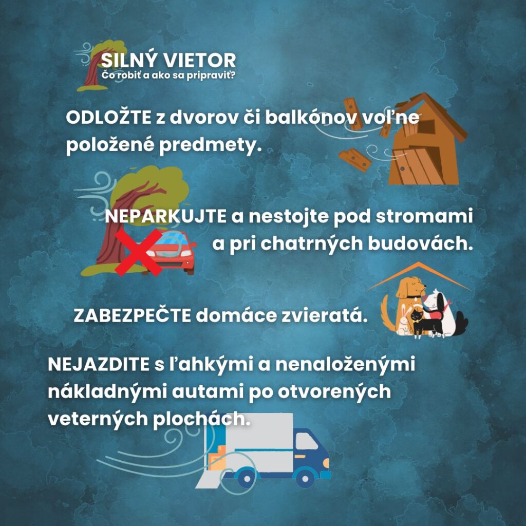 Silný vietor často spôsobuje nebezpečné situácie, najmä v blízkosti nestabilných predmetov alebo starých stromov. Odporúča sa upevniť všetko, čo môže vietor ľahko odniesť, a vyhýbať sa pohybu v oblastiach, kde môže byť riziko padajúcich konárov či elektrických vedení. Rovnako je dôležité byť opatrný pri jazde autom, keďže silný vietor môže značne znížiť kontrolu nad vozidlom. Neodporúčajú sa prechádzky v lese, kvôli možnosti padania suchých konárov zo stromov.