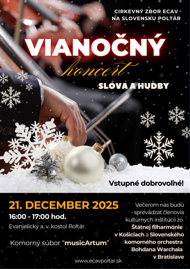 Evanjelický cirkevný zbor v Poltári pripravil pre milovníkov duchovnej a klasickej hudby výnimočné predvianočné podujatie. V nedeľu 21. decembra 2025 sa v priestoroch miestneho evanjelického kostola uskutoční Vianočný koncert slova a hudby, na ktorom sa predstavia špičkoví slovenskí umelci.