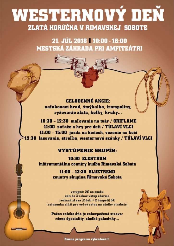 Brány Westernového dňa v Rimavskej Sobote sa otvoria pri amfiteátri o 10:00 hod. Do 16:00 hod. čaká na malých i veľkých návštevníkov pestrý program. Nebudú chýbať westernové scénky, streľba, lasovanie, country tance, jazda na koni, súťaže a atrakcie pre deti i vystúpenie country kapiel. Ako ďalej pre Rimava.sk uviedla Tatiana Koniarová z Mestského kultúrneho strediska, Westernový deň by nebol bez ryžovania zlata. Deti, ale aj dospelí si budú môcť vyskúšať ako sa kedysi ryžovalo zlato a pri troche šťastia možno aj nájdu nejaký plátok „zlata“. Podľa Koniarovej však zlotokopovia neodídu naprázdno, ich odmenou bude parádny certifikát.