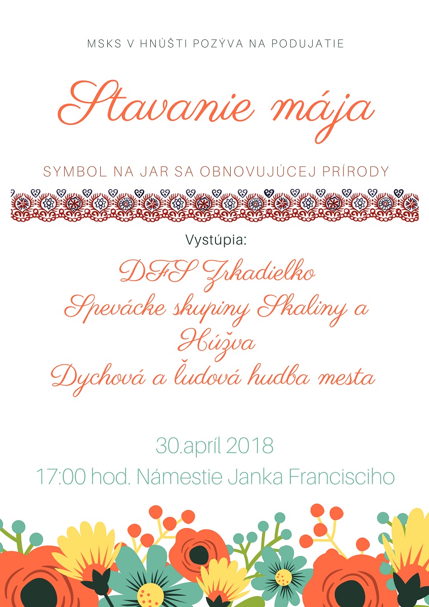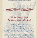Prvá sobota v mesiaci (7.4.) bude okrem iného patriť aj regionálnej súťažnej prehliadke folklórnych skupín z okresu Revúca. Ako nositelia tradícií budú v Kultúrnom dome v Revúcej účinkovať folklórne skupiny Levenda z Muráňa, Revúška z Revúčky, Spod Kohúta z Revúčky - Muránskej Zdychavy a predstaví sa aj tanečníčka Martina Vargová z Rimavskej Soboty. Posledné aprílové dni sa budú už tradične niesť v duchu stavania májov. Stane sa tak v sobotu, 28. apríla, v Kokave nad Rimavicou, Rimavskej Bani a Sušanoch. V Hrnčiarskych Zalužanoch, Hrnčiarskej Vsi, Klenovci, Rimavskom Brezove a Hnúšti vyrastie symbol na jar sa obnovujúcej prírody podľa zvykov až v predvečer 1. mája (30.4.).