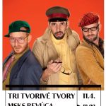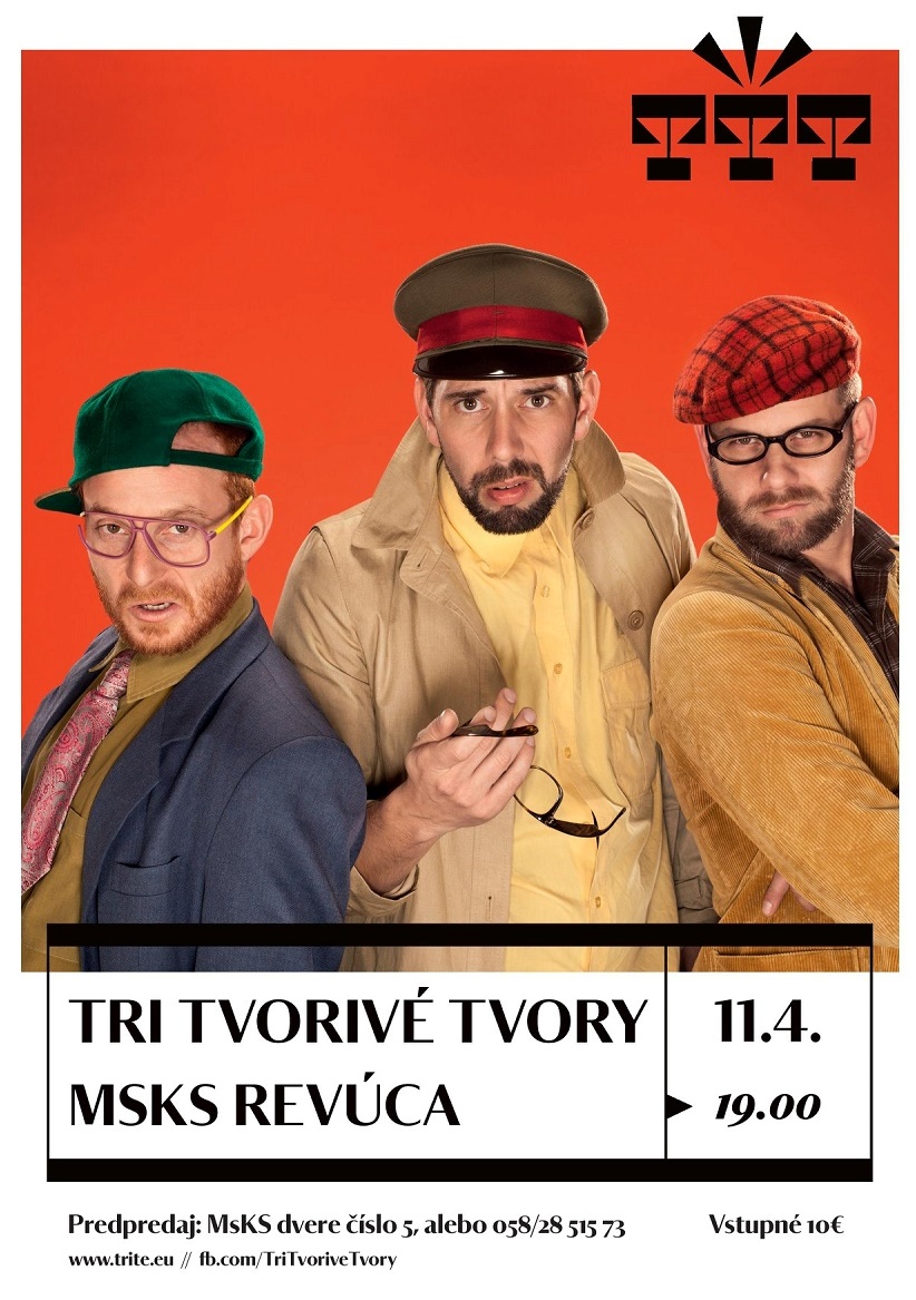 Do Revúcej sa v stredu, 11. apríla, chystajú 3T, alebo Tri Tvorivé Tvory. Divadelno-improvizačná skupina troch hercov, ktorými sú Juraj „Šoko“ Tabaček, Lukáš „Pucho“ Púchovský a Stanislav „Stanley“ Staško. Trojica pôsobí na scéne už od roku 2004 a má za sebou viac ako 450 úspešných vystúpení. Improvizácie sú tvorené priamo na mieste na základe vylosovaných tém od divákov, ktorí tak vytvárajú neopakovateľný humorný dej. Známe tváre z telky, neznáme historky a zábavná stand up comedy show. Silné reči v podaní Tomáša Hudáka, Jakuba Gulíka, Simony a Jara Abaffyho navštívia už vo štvrtok, 19. apríla, Mestské kultúrne stredisko v Rimavskej Sobote.