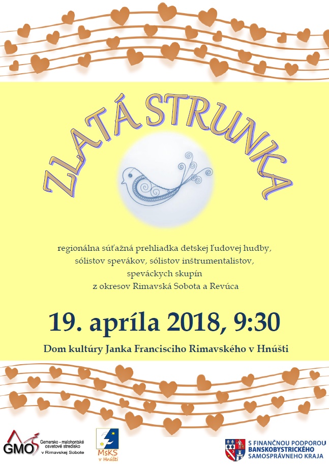 V Dome kultúry v Hnúšti sa to bude vo štvrtok, 19. apríla, mladými talentami len tak hmýriť. Koncerty vystrieda regionálna súťaž detských speváckych skupín, sólistov a ľudových hudieb pod názvom Zlatá Strunka. Zochova divadelná Revúca prinesie aj tentokrát tri dni plné divadelných predstavení a skvelých hereckých výkonov. V poradí 44. ročník krajskej divadelnej prehliadky činoherného divadla a divadla mladých sa odohrá v dňoch od 26. do 28. apríla (štvrtok - sobota) v Mestskom kultúrnom stredisku. V rámci podujatia bude prebiehať aj autorská výstava Rastislava Ekkerta - Ľudia z planiny.