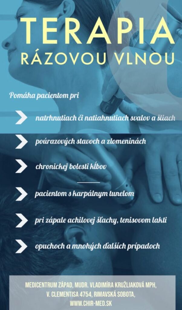 Počuli ste už o liečbe rázovou vlnou? Ide o bezbolestné neinvazívne ošetrenie. Pri akútnych príznakoch výrazne zmierni či až odstráni bolesť už po prvom ošetrení a pri chronických problémoch už po troch až piatich ošetreniach.