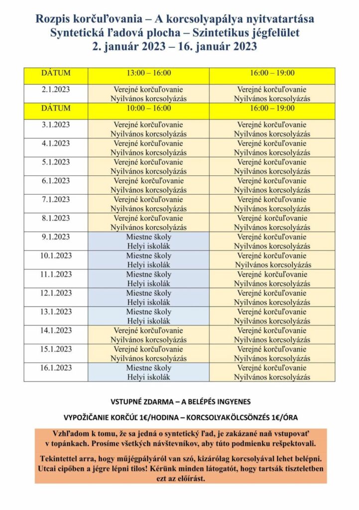 Verejné korčuľovanie bude podľa zverejneného harmonogramu trvať oddnes do 16. januára. Na mieste je možné si za poplatok 1 euro vypožičať korčule. Harmonogram, kedy je ľadová plocha prístupná verejnosti, nájdete nižšie.