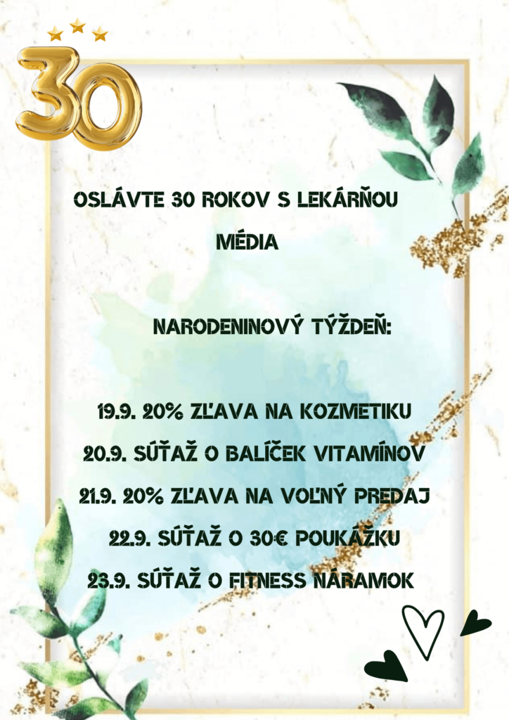 Oslava 30. narodenín bude prebiehať celý týždeň, od pondelka do piatka (19. - 23. 9.). Na každý deň sú pripravené zaujímavé akcie či darčeky. Príďte aj vy osláviť narodeniny s Médiou a odneste si so sebou jeden z darčekov či obľúbené produkty v extra zľave. Tím lekárne Média sa na vás bude tešiť.