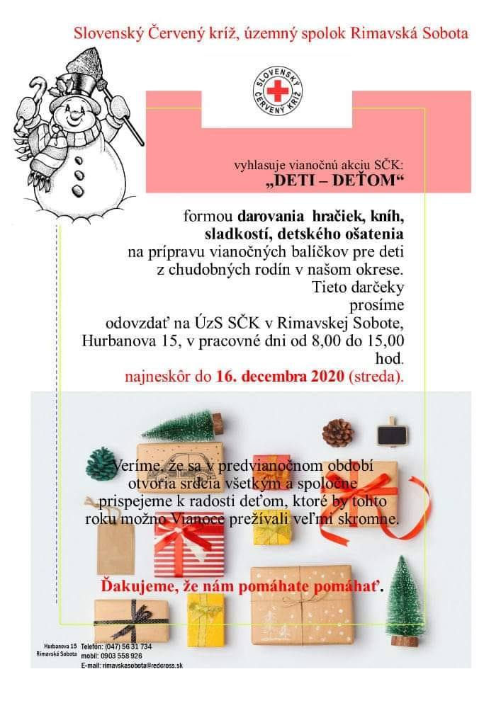 Vianočná akcia Slovenského červeného kríža v Rimavskej Sobote má tento rok trochu inú formu. Keďže sa do zbierky v čase prevažne zavretých škôl nemohlo zapojiť toľko detí ako po minulé roky, pracovníci SČK sa obracajú aj na širokú verejnosť.
