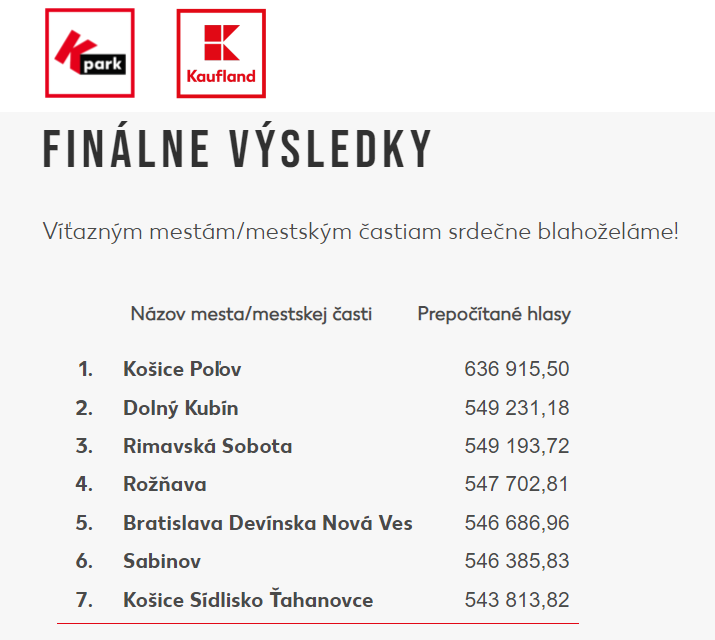 Rimavská Sobota sa ale udržala v top 7 miest a mestských častí, ktoré budú ocenené novým parkom. Poďakovanie patrí aj obyvateľom miest a obcí z okolia Rimavskej Soboty, i zo vzdialenejších miest, ktorí naše mesto počas celého hlasovania podporovali. Veľa síl do hlasovania vložilo aj niekoľko obyvateľov mesta, ktorí burcovali ľudí vo facebookovej skupine.