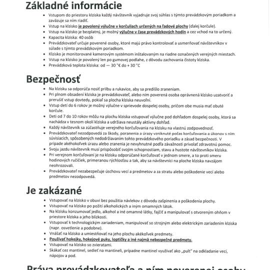 ​V záujme zachovania kvality povrchu a bezpečnosti je prísne zakázané na plochu vstupovať v bežnej obuvi, konzumovať tam jedlo a nápoje, fajčiť či používať hokejky a puky. Priestor je monitorovaný kamerovým systémom a na poriadok dohliadajú poverené osoby.