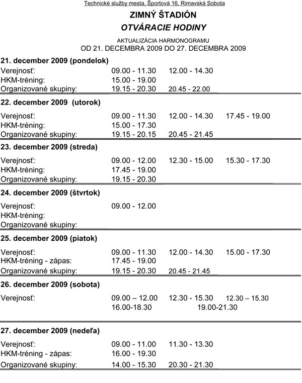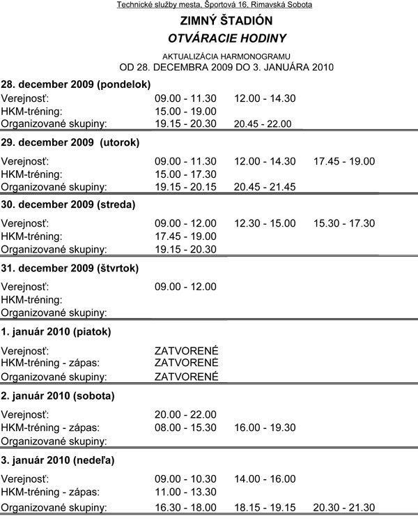 V novom roku sa brány štadióna otvoria po prvýkrát v sobotu, 2. januára, kedy sú na programe zápasy, verejnosť si môže zakorčuľovať vo večerných hodinách od 20-tej do 22.00 hod.