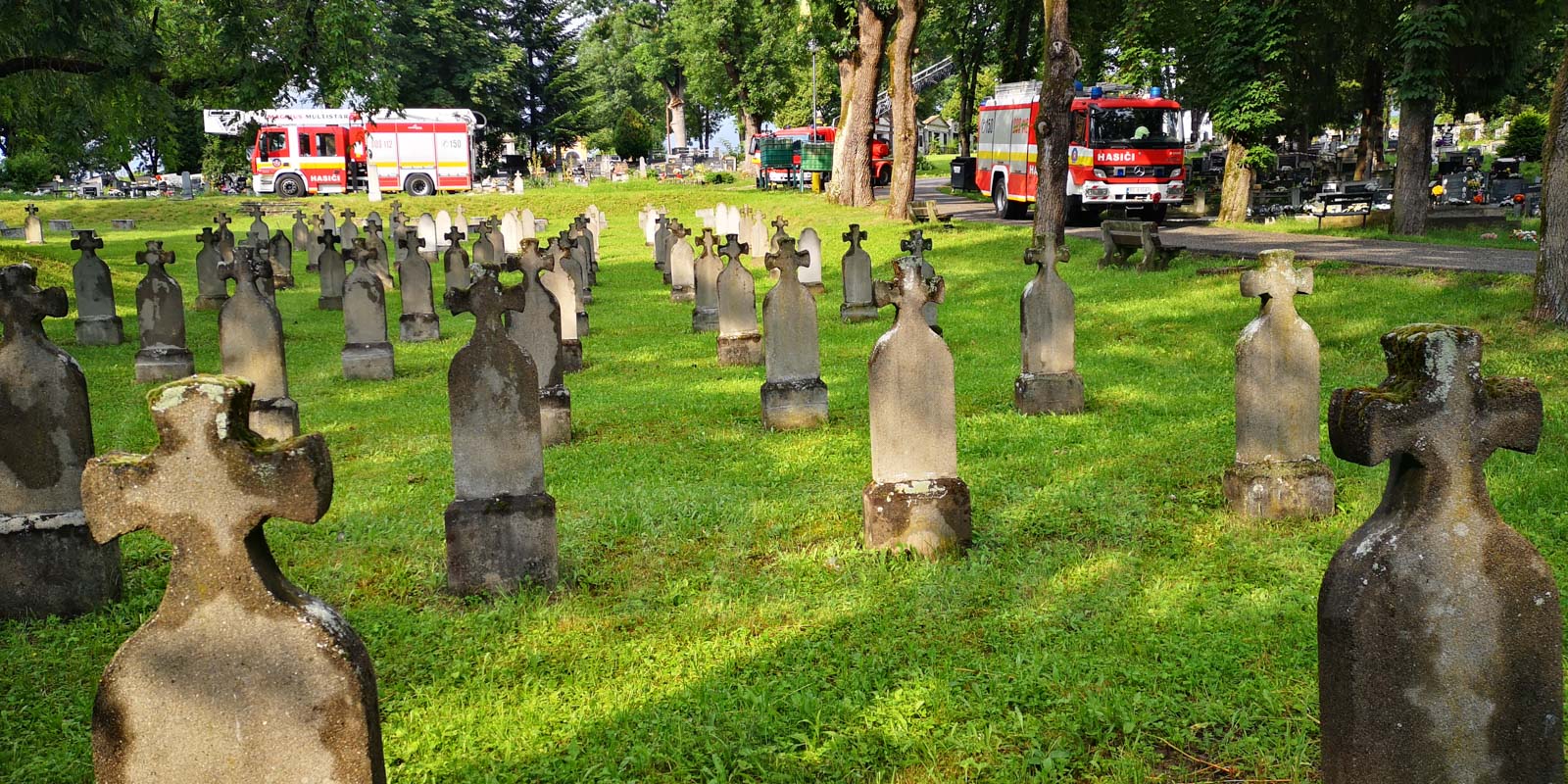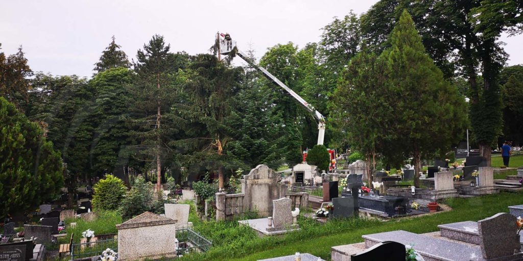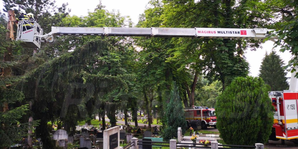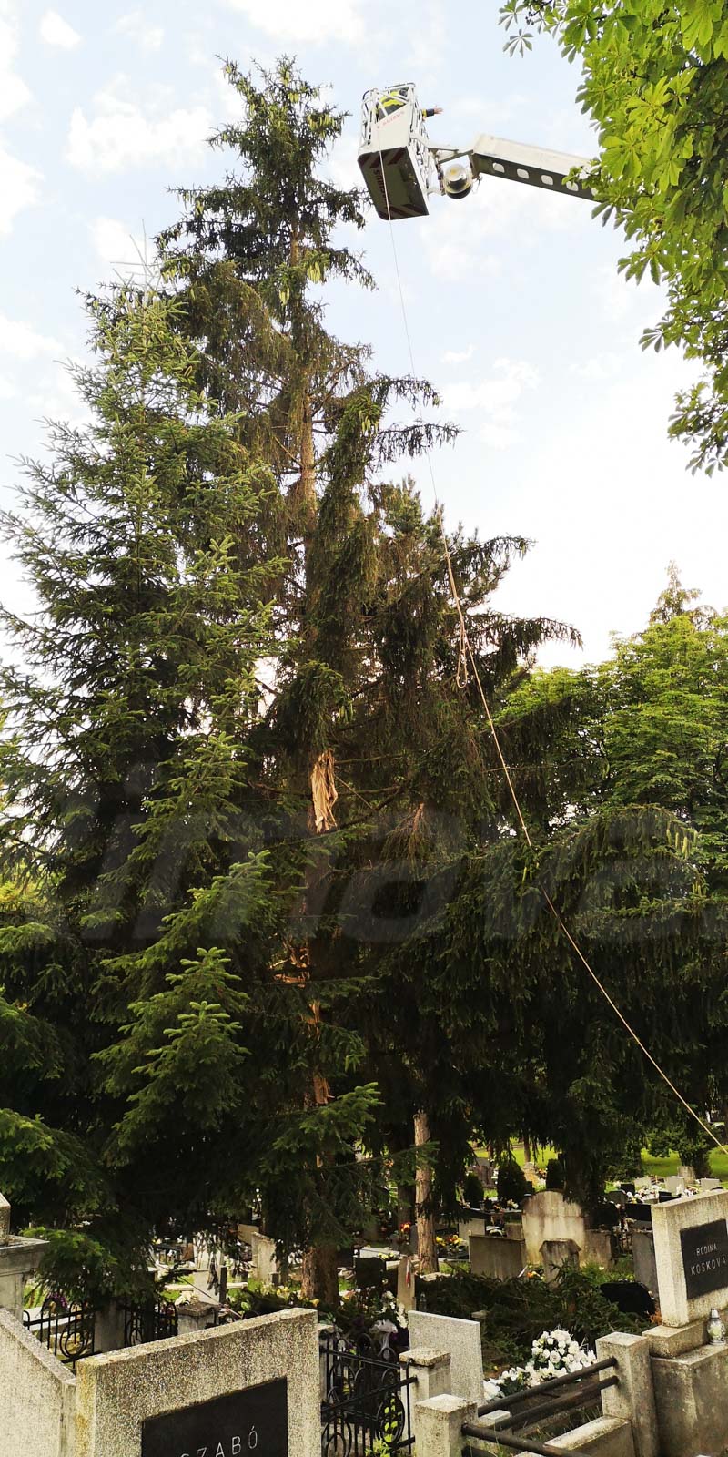 Pri záchrane života a ochrane zdravia sú niekedy dôležité aj sekundy. Hasiči vybavení technikou tentokrát zápasili so stromom na komplikovanom mieste viac ako päť hodín. Pri opiľovaní museli dávať pozor, aby čo najmenej poškodili mramor na hroboch pod stromom. Keby sa však strom zvalil, poškodil by ešte viac náhrobných kameňov. Dvaja hasiči motorovou pílou postupne opiľovali vetvy a urobili si tak plochu, ktorá tlmila ďalšie nárazy. Korunu stromu, ktorá sa kývala, spúšťali aj pomocou lana a kmeň postupne po klátikoch zhadzovali ku koreňom. Podľa ich slov boli konáre v mieste zasiahnutého bleskom omnoho tvrdšie, ako inde, lebo zatupili aj pílu. Podľa slov správcu cintorína v uplynulých rokoch vypiľujú postupne nebezpečné a vysoké stromy a v cintoríne platí zákaz ich vysádzania.