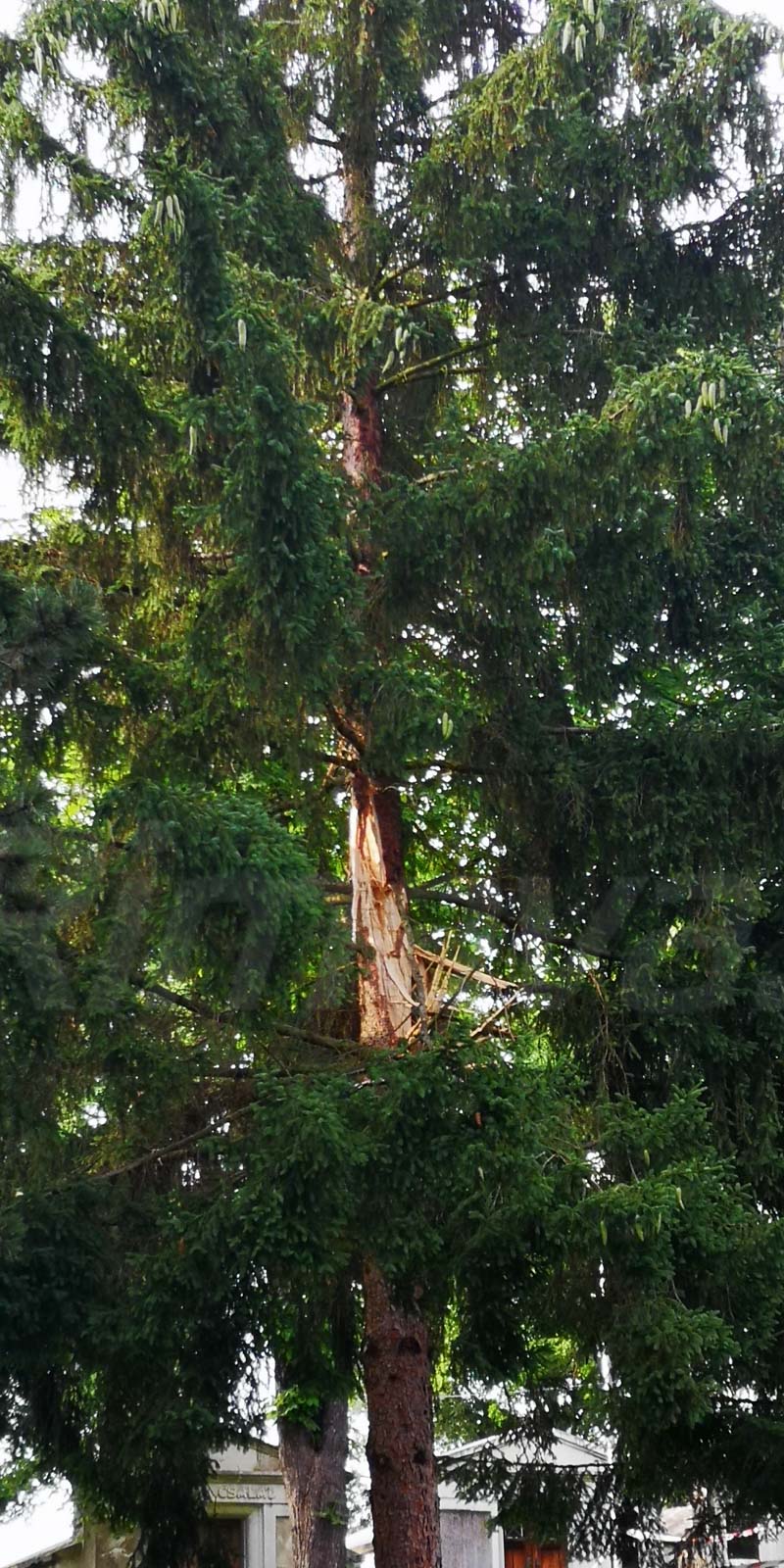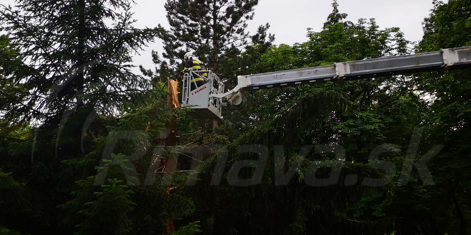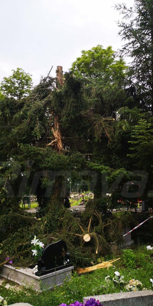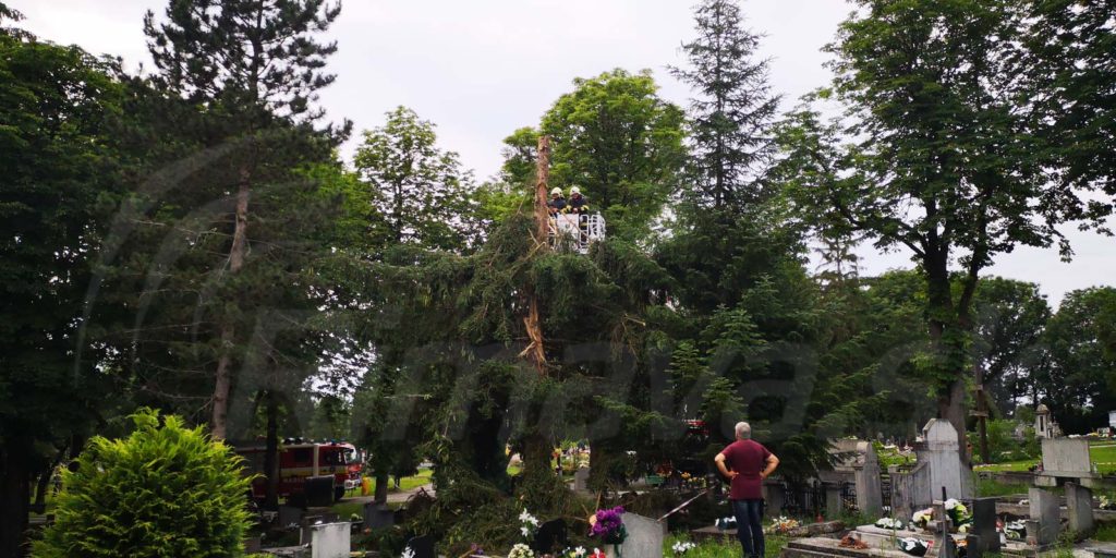 Blesk udrel aj do stromu na hlavnom cintoríne v R. Sobote. Asi 25-metrový smrek ostal špirálovite rozštiepený na viacerých miestach. Pracovníci v neďalekom Dome smútku počuli veľký buchot. Podľa Barta išlo o najväčší problém, pri ktorom strom ohrozoval hroby a nevedeli už naň vyliezť, a preto zavolali hasičov. „Dostal dva zásahy bleskom. Vytrhalo z neho také triesky ako hrom, ako keby v tom strome niečo vybuchlo. Nevedeli sme sa k nemu dostať, bol aj v kopci. Nemáme takú techniku," povedal pre Rimava.sk Barto. Hasiči na tom pracovali, od tretej do pol deviatej večer. K stromu sa ale svojou výškovou technikou v kopci dostať nevedeli, opílili tak okolité konáre pri ceste a musela prísť ďalšia technika z Lučenca.