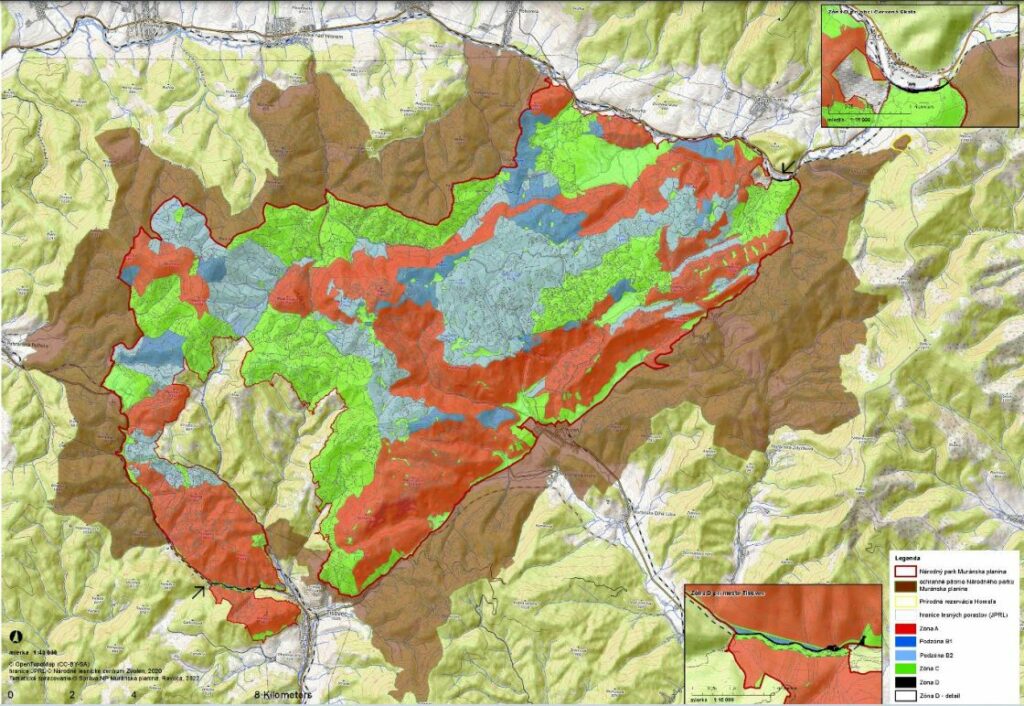 Mapa hranice národného parku, hraníc zón národného parku a jeho ochranného pásma. Mapu národného parku je možné nájsť v Komplexnom informačnom a monitorovacom systéme. Zdroj: Nariadenie vlády Slovenskej republiky, ktorým sa vyhlasuje Národný park Muránska planina, jeho zóny a ochranné pásmo