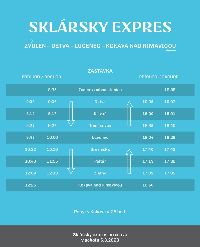 KOKAVA NAD RIMAVICOU – Na objavovanie tajov sklárskeho remesla sa v sobotu (5. augusta) vydá zo Zvolena do Kokavy nad Rimavicou Sklársky expres. Historický vlak vás prevedie dejom remeselného sklárstva v regióne, kde táto tradícia pretrváva už viac ako 215 rokov.