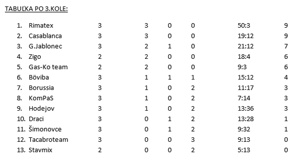 15.dec.2014 - Na zimnom halovom turnaji v Jesenskom sa počas uplynulého piatku zrodilo päť víťazstiev a jedna remíza. Bez straty bodu naďalej po treťom kole ostal tím Rimatex a Casablanca, prvé body získali aj družstvá z konca tabuľky, keď Draci a Šimonovce medzi sebou remizovali 6:6. Najlepším strelcom po 3. kole je L.Šťavina (Rimatex) 15 gólov, 2. M.Dragijský […] Ďalej...