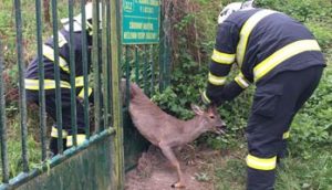 Srnec sa zasekol v bráne a museli ho ratovať hasiči z Lučenca
