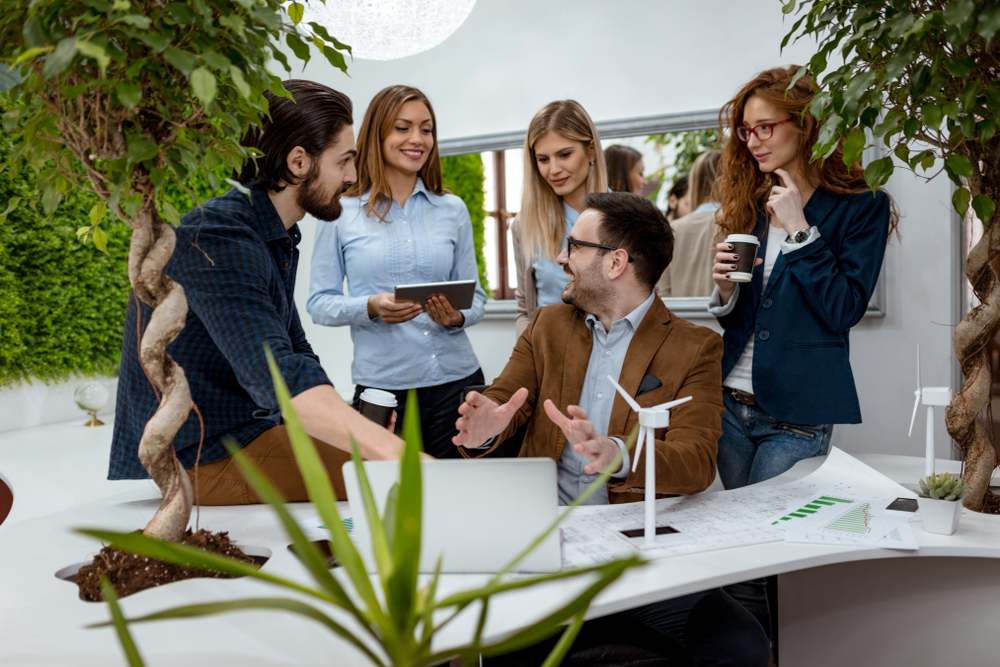 Tento moderný koncept sa sústreďuje na integrovanie prírodných prvkov, živých organizmov a čo najväčšieho množstva denného svetla do interiérového dizajnu. Biofilné prostredie prispieva k celkovému komfortu, pracovnej spokojnosti a príjemnej estetike. Vítané sú drevené povrchové úpravy (napr. kancelársky rastúci stôl s pracovnou doskou z drevotriesky) a vždyzelené izbové rastliny v dekoratívnych kvetináčoch.